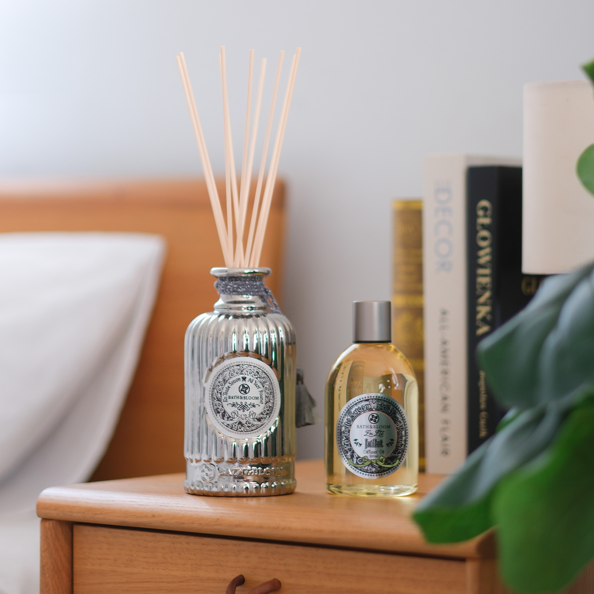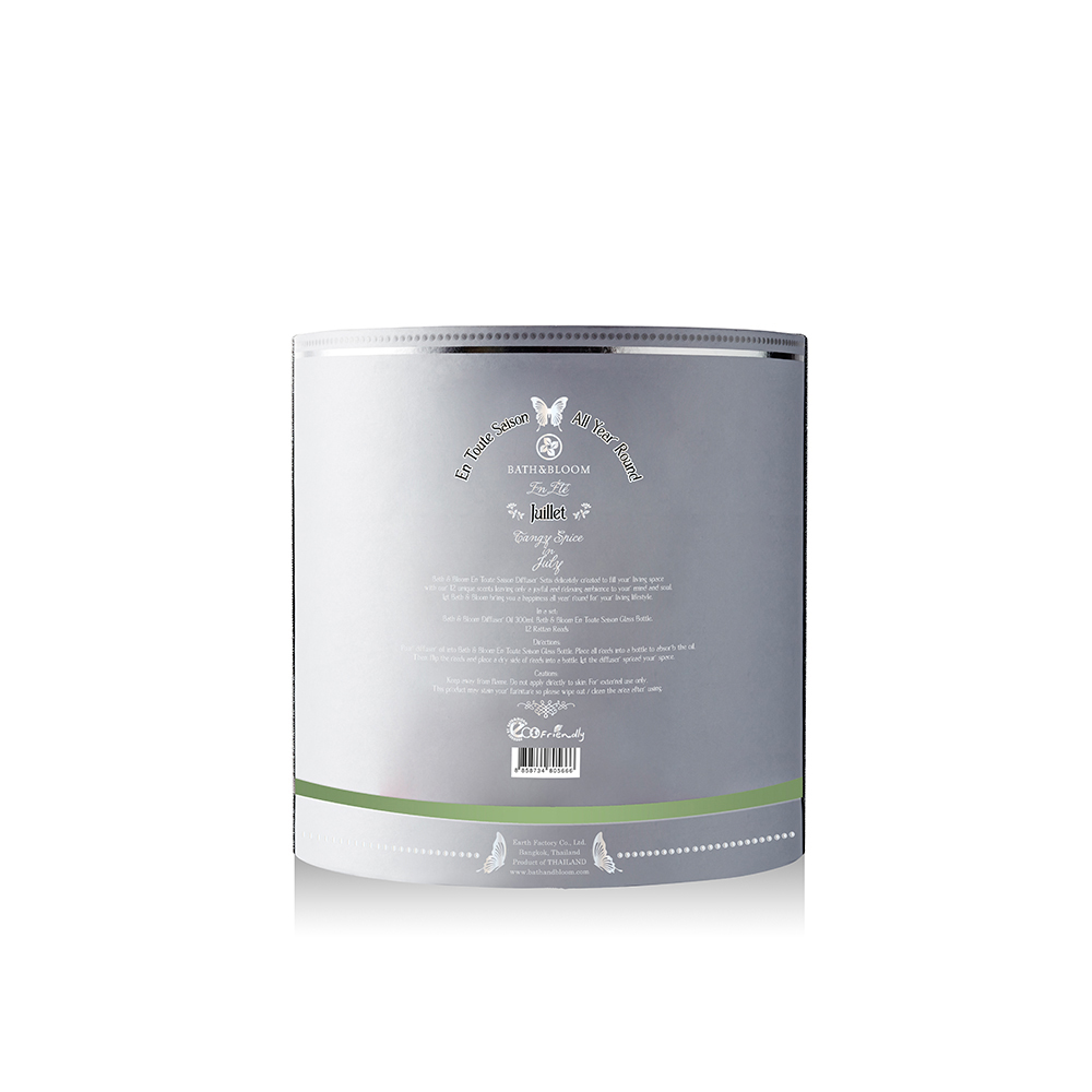 ชุดผลิตภัณฑ์น้ำมันหอมระเหยปรับอากาศ กลิ่น Juillet (July) หรือกลิ่นเดือนกรกฎาคม ช่วยสร้างจิตใจให้เพลิดเพลินเบิกบาน หายใจสดชื่นตลอดทั้งวัน อีกทั้งยังช่วยดับกลิ่นไม่พึงประสงค์ภายในบ้านให้คุณอีกด้วย