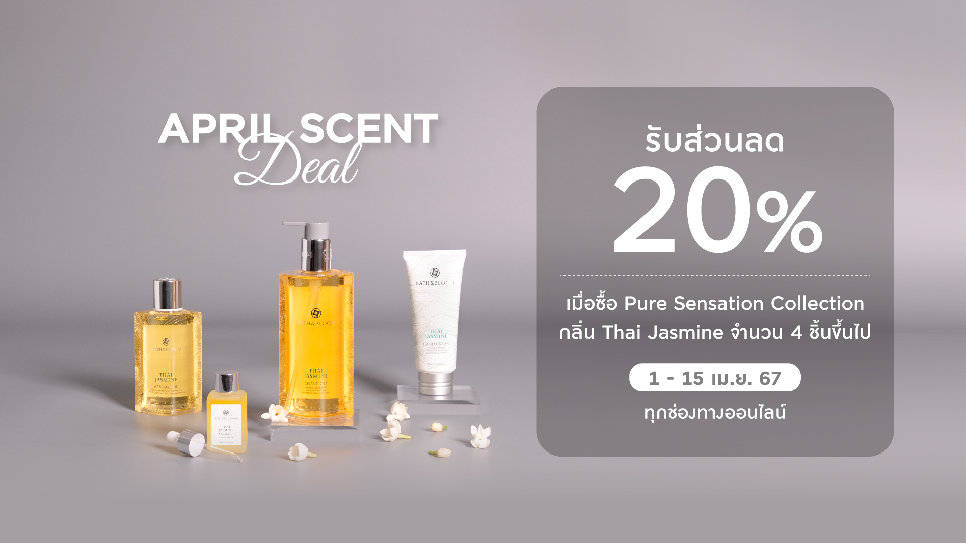 APRIL SCENT DEAL กลิ่นหอมจากดอกมะลิเติมความชุ่มชื้นให้กับผิวคุณ และสัมผัสกลิ่นหอมดอกมะลิที่คุ้นเคย ชวนให้ผ่อนคลาย และช่วยให้อารมณ์ดีขึ้น