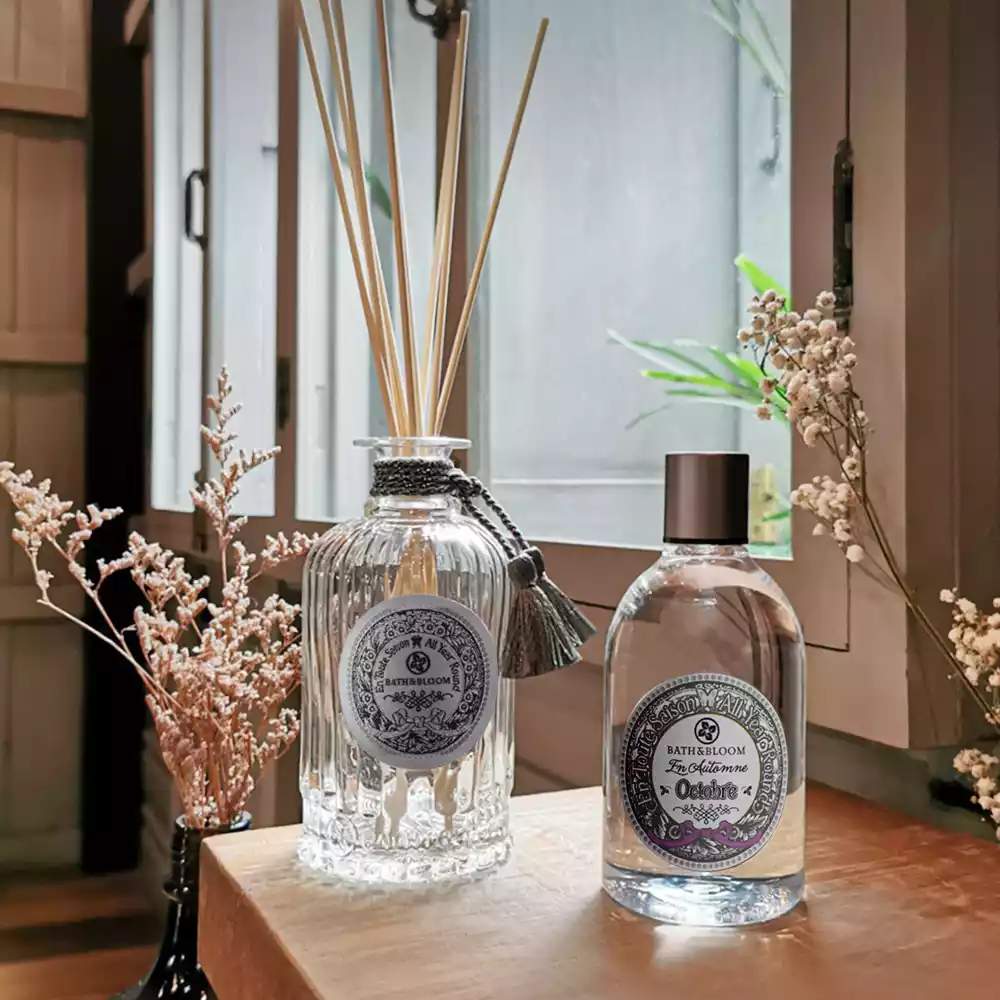 Fulfill the charm to your life by the fragrance of Jasmine, Rose, Lily and dry leaves starting to change color and fall to field. Creating a peaceful but delightful and excitement atmosphere for the upcoming of the end of the year. Bath & Bloom En Toute Saison diffuser is made from non-toxic and bio-degradable ingredients. It fills your living space with our unique scent and leaves only a joyful and relaxing ambience to your mind and soul. Let Bath & Bloom bring you a happiness all year round for your living lifestyle. Directions: Pour diffuser oil into glass / ceramic container. Place all reeds into a container to absorb the oil. Then, flip such reeds and place a dry side of reeds into a container. Let the diffuser spread your space.